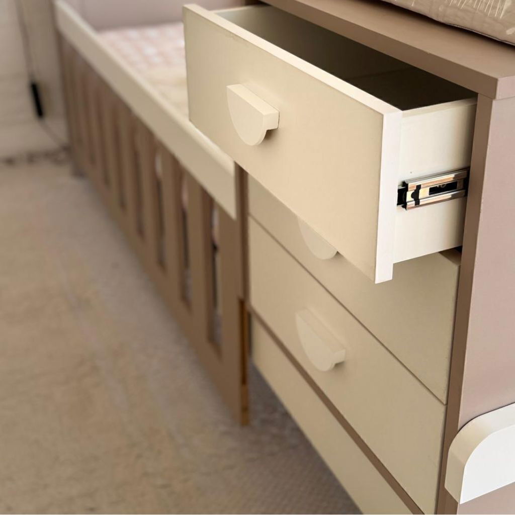Diseñada para acompañar su crecimiento desde los primeros días. Se transforma fácilmente en cama de una plaza, mesa de luz y baulera, ofreciendo funcionalidad y diseño en un mismo mueble.