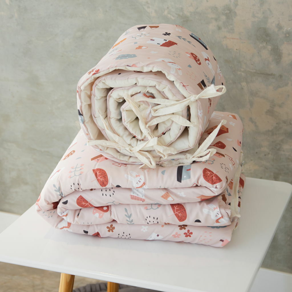 Un conjunto que combina protección, calidez y diseño en un mismo producto. El acolchado incluye chichoneras a tono, confeccionadas en tela gabardina estampada, resistente y de gran durabilidad, ideal para uso diario.
